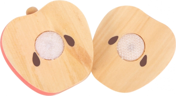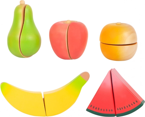 Farverige træstykker (æble, pære, banan, appelsin, melon) kan nemt skilles ad og samles igen takket være velcroen – ideelt til at øve korrekt skæreteknik.