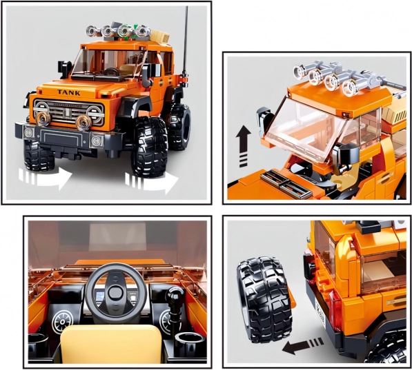 Oplev glæden ved at konstruere et terrænkøretøj inspireret af amerikanske SUV’er. Modellen i orange-sort design med massive hjul, tagbærer og detaljeret kølergrill er perfekt til actionfyldte scener eller som udstillingsmodel på hylden. Takket være robust ABS-plast er byggesættet holdbart og sikkert.
