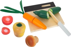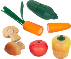 Dette træskæresæt med grøntsager er ideelt til butikleg, madlavning og små kokkeudfordringer. Peberfrugt, champignon, tomat, agurk og gulerod er opdelt i dele og forbundet med velcro, så børn igen og igen kan “skære” dem med den sikre trækniv. Sættet inkluderer også et skærebræt med ophængsøje og kridttavleside – perfekt til indkøbslister eller opskrifter.