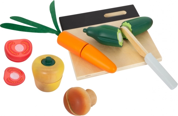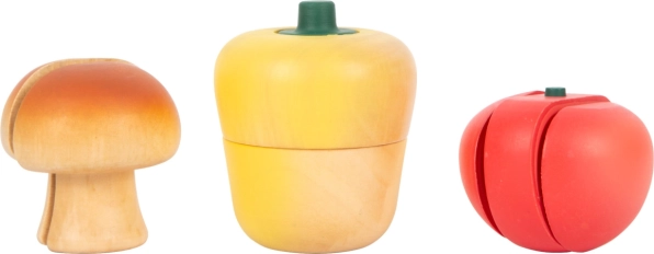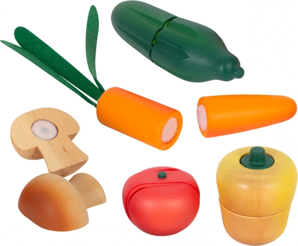 Tomat, peberfrugt, agurk, gulerod og champignon er delt i halve og holdes sammen af velcro – ideelt til træning af sikker skæring.