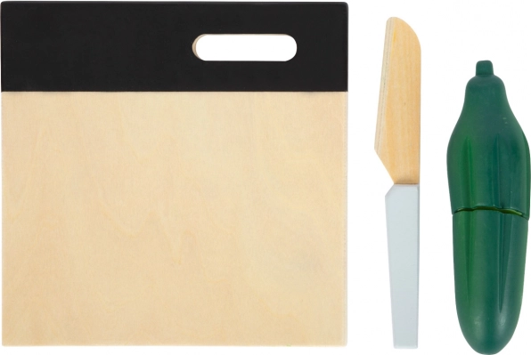 Indeholder trækniv, skærebræt og grøntsager. Den genanvendelige emballage bruges til opbevaring af legetøjet og lærer børn om miljøbevidsthed.