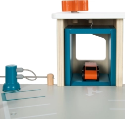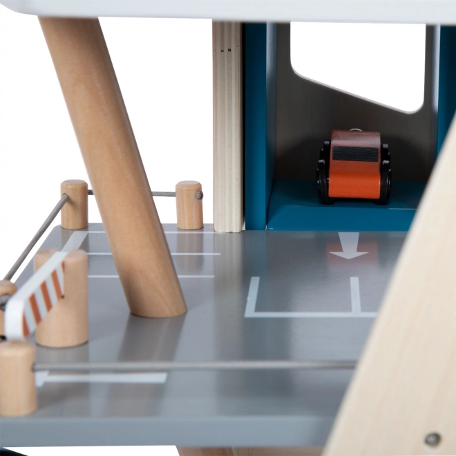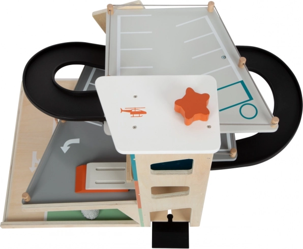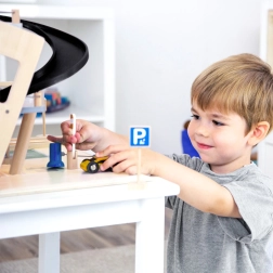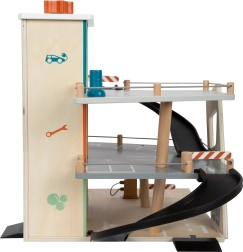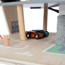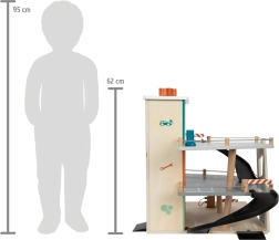 Dette stilfulde træparkeringshus til racerbiler bringer et rigt udstyret legeunivers til børn. Tre etager er forbundet med en funktionel elevator og to glidende ramper, der giver bilerne jævnt flow. Hvert niveau er udstyret med en mekanisk bom og gummiafskærmning, som øger dynamikken og forhindrer, at køretøjerne falder ud. Farvede ikoner og vejskilte støtter læring gennem leg og udvikler fantasien.