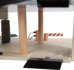 Børn kører bilerne op med elevatoren og lader dem suse ned ad de glidende ramper. Realistiske detaljer og mekaniske bomme øger spændingen og spilbarheden.