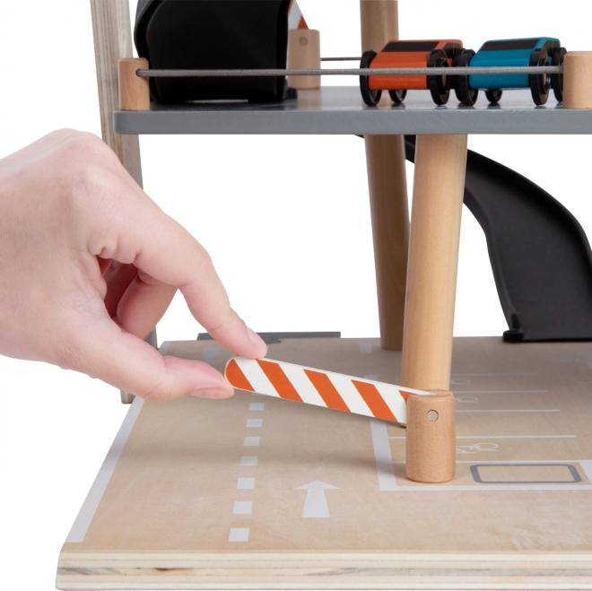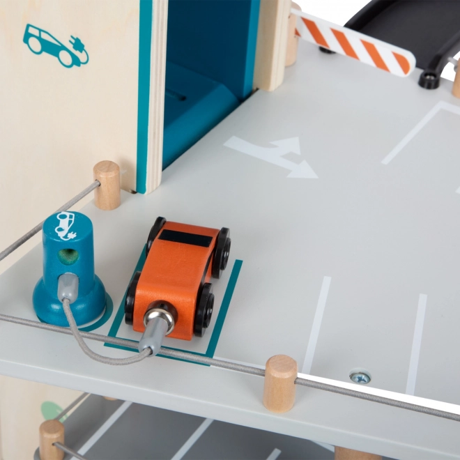 Opdag et alsidigt træparkeringshus med tre etager, funktionel elevator og glidende ramper til timevis af kreativ leg. Inkluderer 2 biler, tankanlæg og ladestation, løfterampe og vask med realistiske børster. Mekaniske bomme på hvert niveau og gummiafskærmning for sikker kørsel giver legen ekstra dynamik. Den holdbare kombination af træfiner, massivt træ og ugiftig plast sikrer lang levetid.