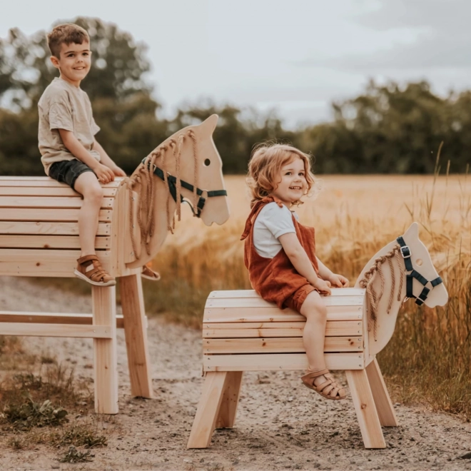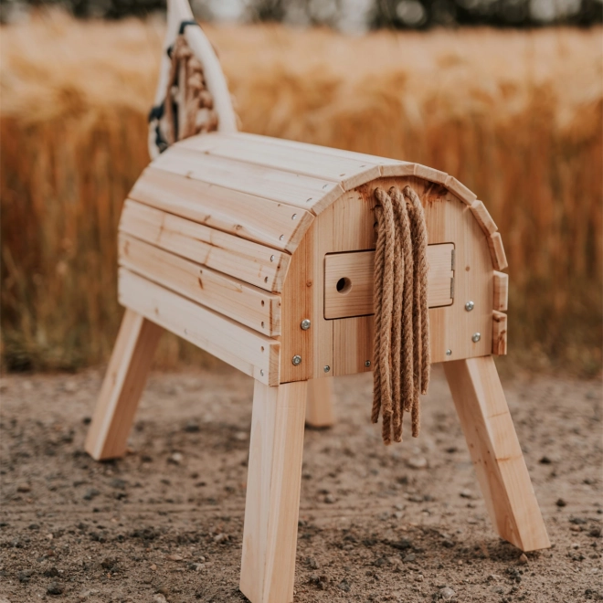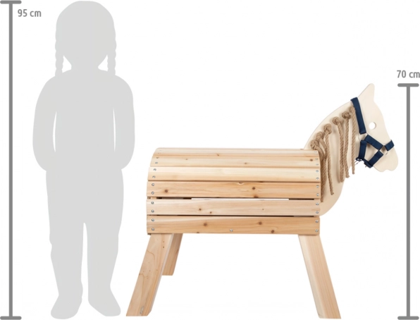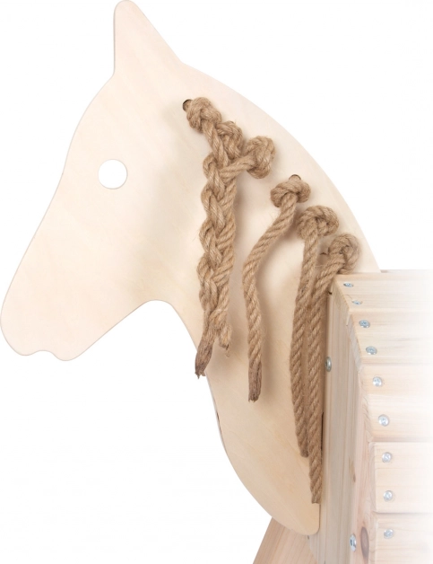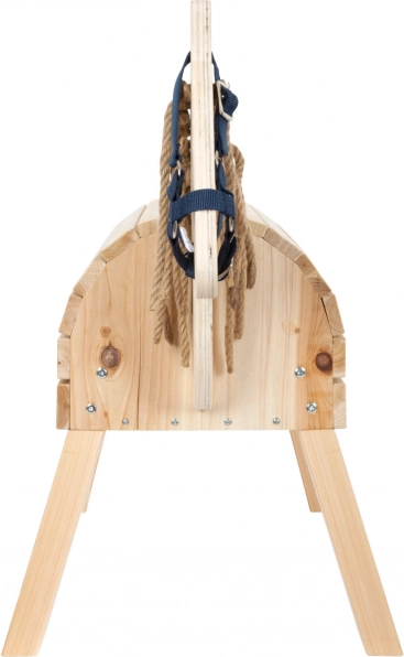 Træhesten står på robuste ben, som sikrer stabilitet og sikkerhed under leg. Takket være denne konstruktion er den velegnet til børn fra 3 år.