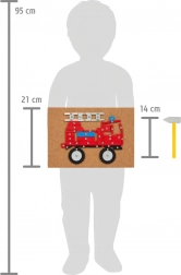 Omfattende kreativt legetøjssæt med transporttema, der indeholder en korkunderlag, en træhammer og mange trædele i forskellige former og farver. Hjælper med at udvikle kreativitet, fingerfærdighed og hånd-øje-koordination.