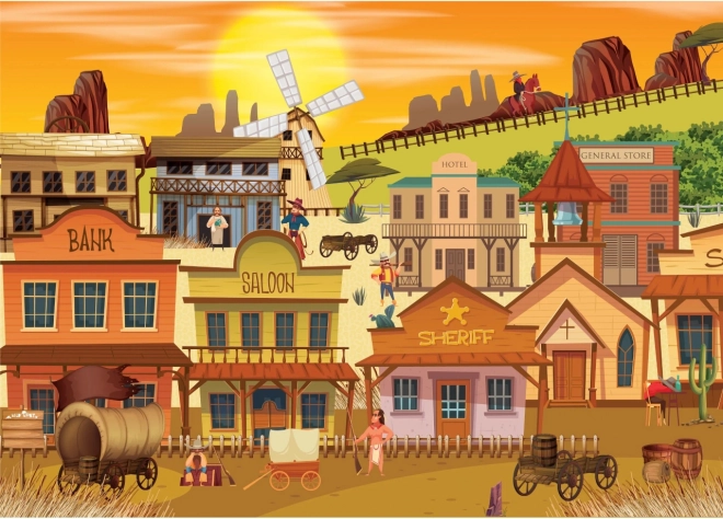 Dyk ned i den farverige verden fra Det Vilde Vesten med et motiv fyldt med detaljer – saloon, bank og sherifkontor suger dig ind i stemningen ved solnedgang. BRAIN TREE-puslespil udmærker sig ved førsteklasses tryk og mat overflade, som gør multireliefdetaljer perfekt læsbare under alle lysforhold.