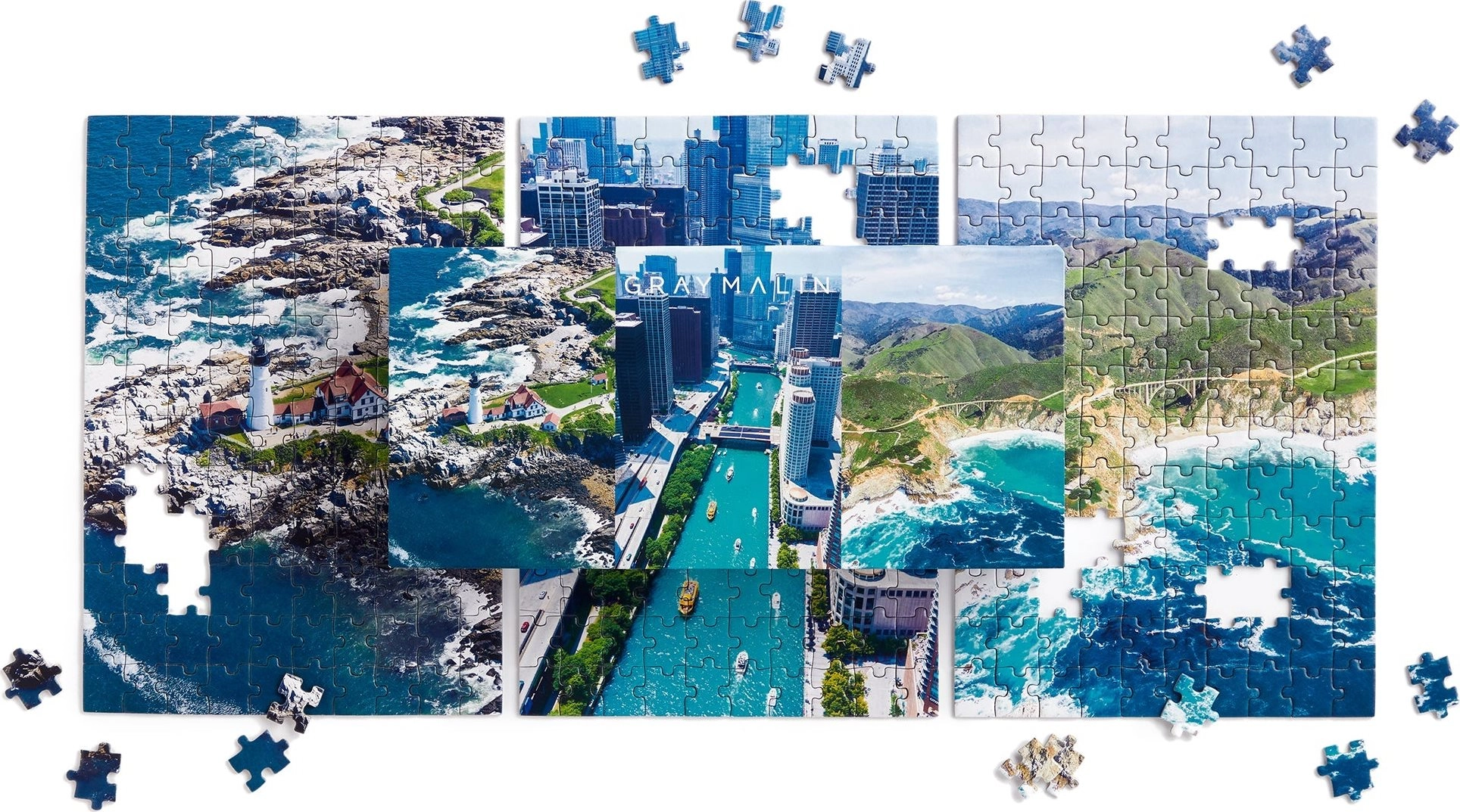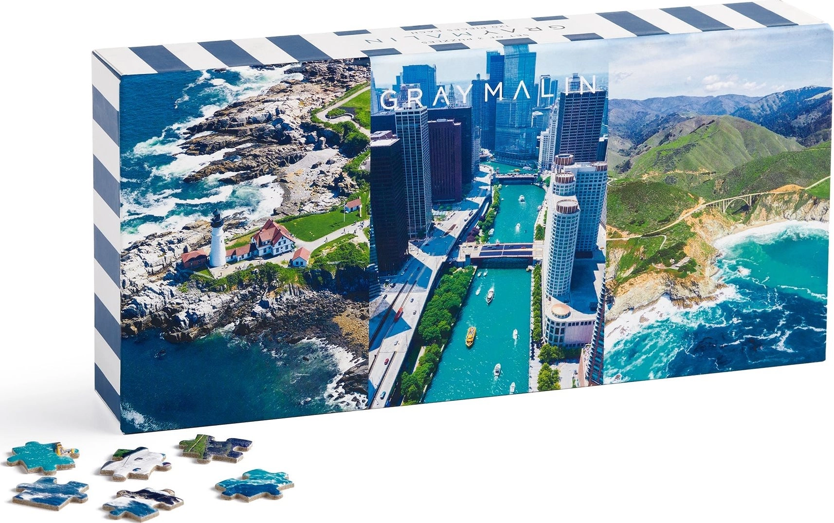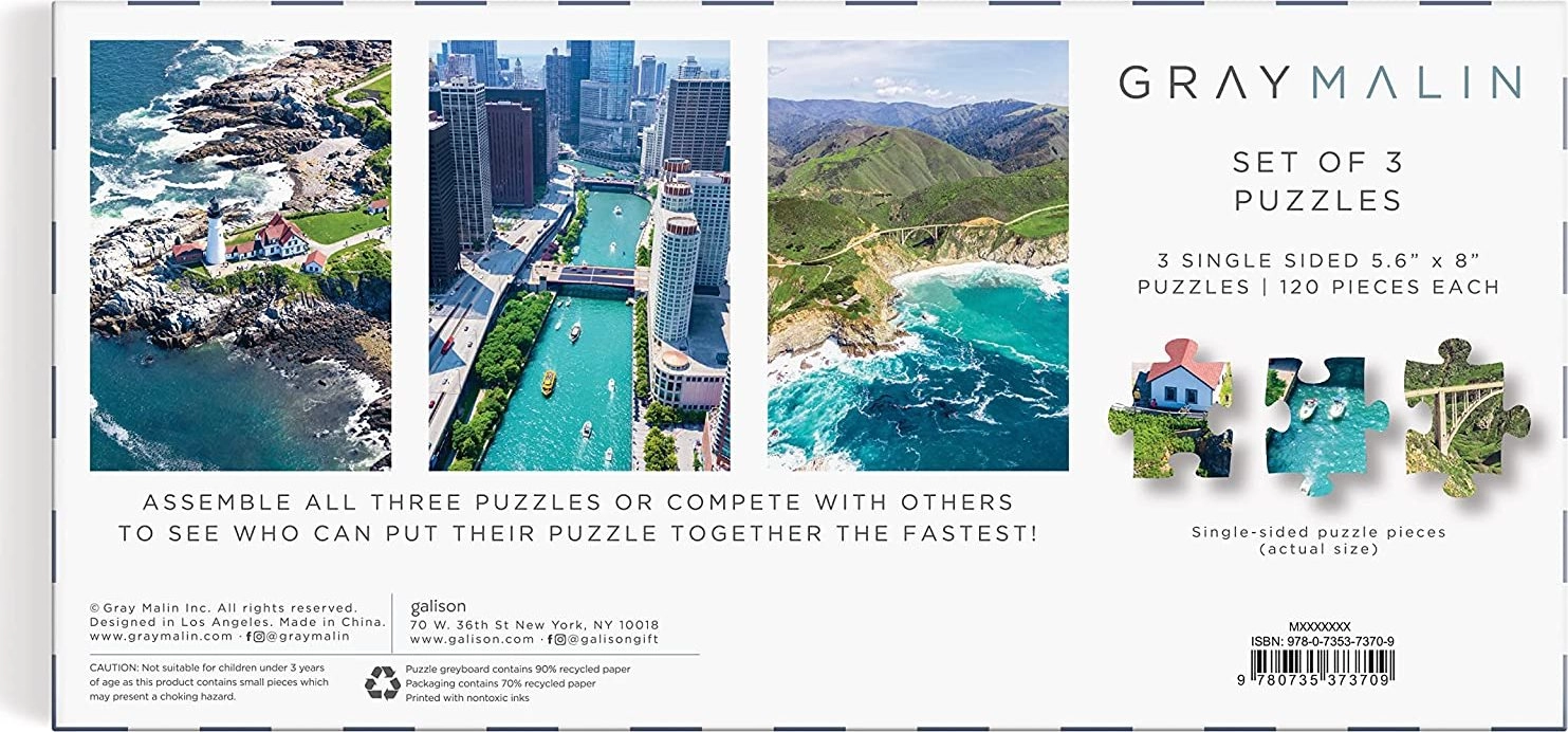 Denne eksklusive kollektion omfatter tre separate puslespil med ikoniske motiver fra Maine, Chicago og Big Sur, der bærer fotografen Gray Malins umiskendelige stil. Hvert puslespil er pakket for sig i en attraktiv æske, så du kan give dem enkeltvis eller nyde dem som et samlet sæt.