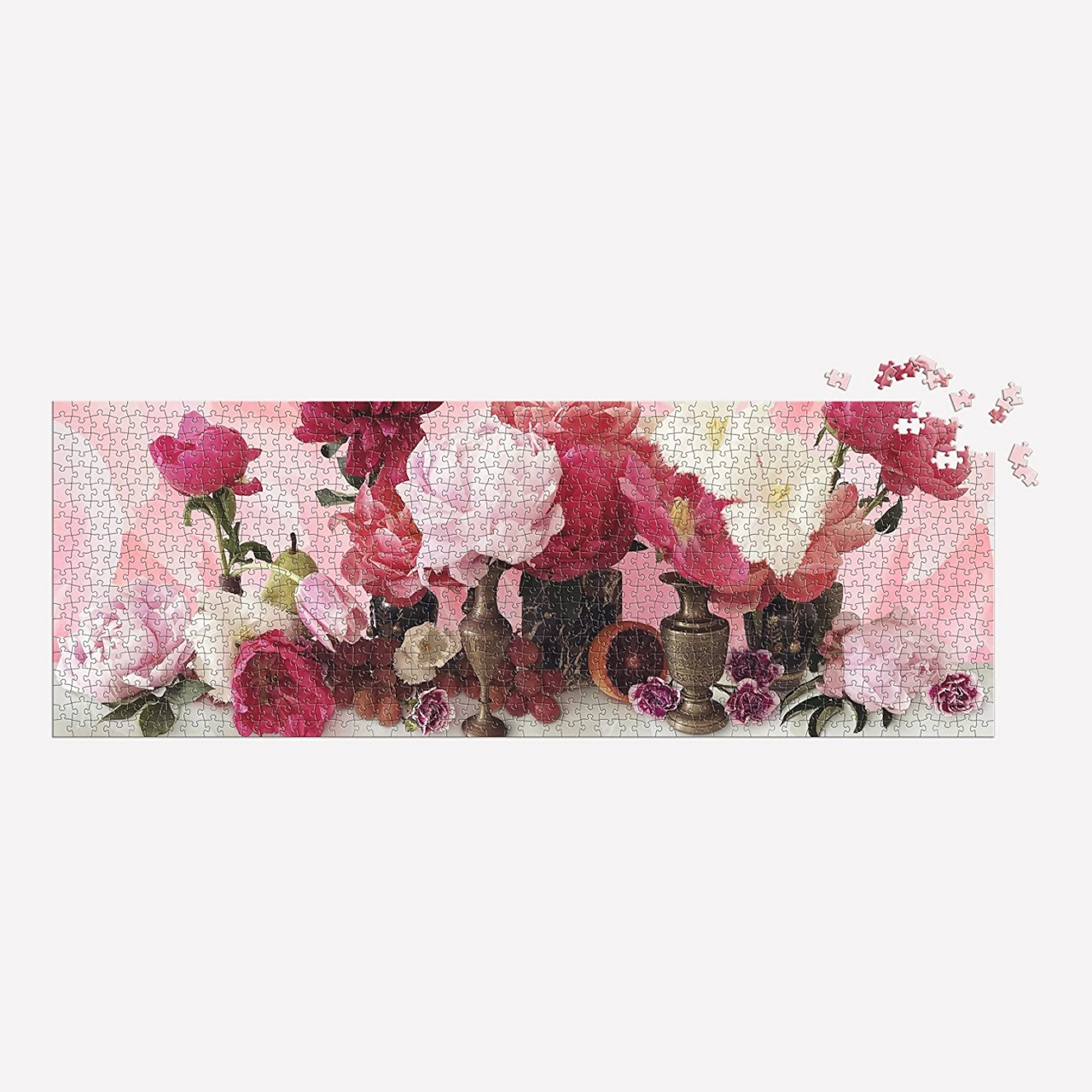 Det panoramiske puslespil Endless Love præsenterer et elegant blomsterstilleben fyldt med tulipaner og pæoner i sarte rosa og grønne nuancer. Takket være førsteklasses tryk og mat finish træder detaljer og farvedybde tydeligt frem, så samlingen er lige så smuk som det færdige billede. Værket er skabt af den amerikanske kunstner og fotograf Ashley Woodson Bailey, kendt for sine raffinerede botaniske kompositioner.