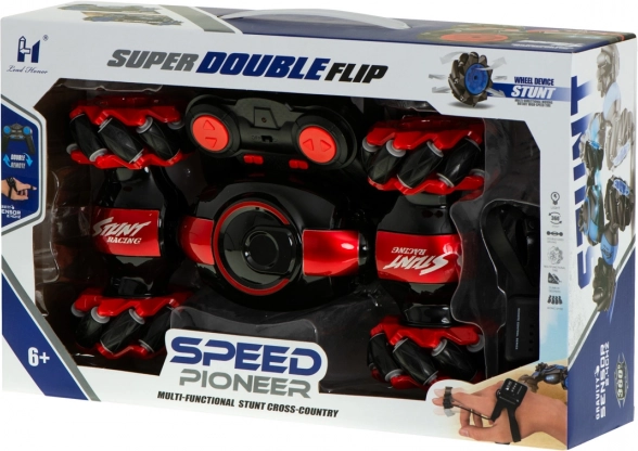 Oplev adrenalinet med stunt RC-bilen SPEED PIONEER 360 i blå. Med to fjernbetjeninger – en klassisk joystick og et armbånd med gravitetssensor – kan du styre med håndbevægelser. Bilen er dobbeltsidet, klarer 360° rotationer, har 2 køretilstande (race og off-road), omnidirektionelle hjul og rækkevidde op til 20 m på 2,4 GHz.