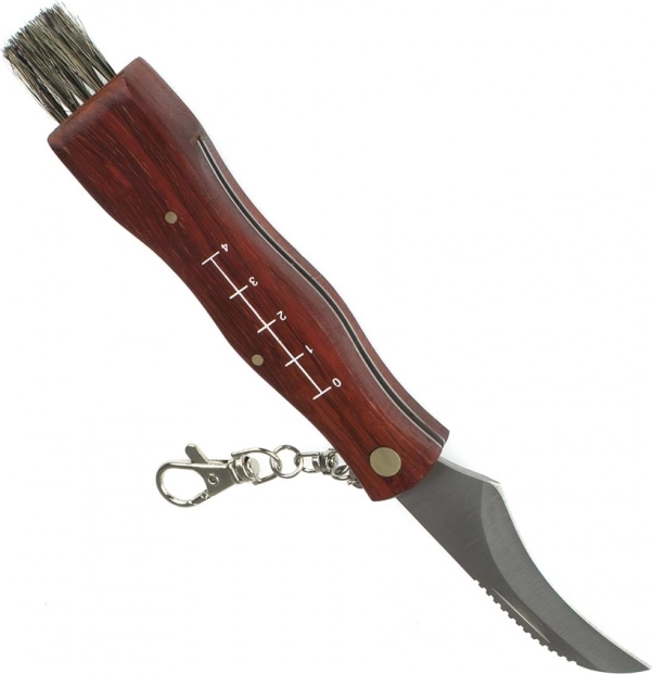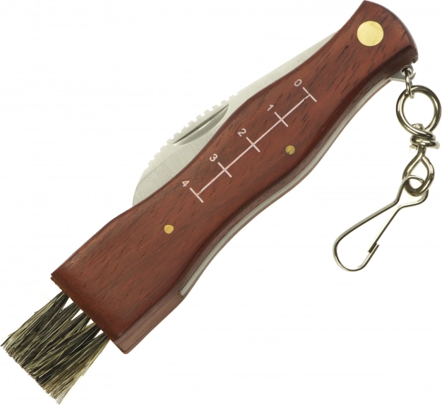 Denne alsidige svampekniv kombinerer et skarpt, buet blad til præcis afskæring af svampe med en fin børste til at fjerne snavs. Det træhåndtag ligger godt i hånden, og den integrerede målestok på den ene side hjælper dig med hurtigt at vurdere størrelsen på dit fund.