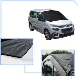 Monteringen er hurtig og skånsom – i den øverste og nederste del er der indsyet 3 små magneter, som fæstner sikkert til karrosseriet. Siderne sikres ved at blive klemt i dørene, så selv kraftig vind ikke blæser dækkenet af. Vedligeholdelse er nem: tør af med en fugtig klud eller håndvask.
