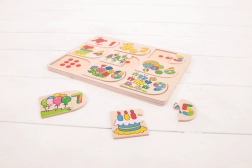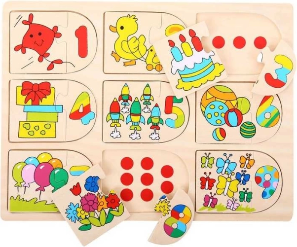 Dine små nysgerrige børn vil helt sikkert elske dette lille, interessante og smarte puslespil. Ikke alene vil de nyde at sortere brikkerne de rigtige steder, de kan også indsætte selve billederne og derefter matche dem med de rigtige tal. Hver træbrik er udformet, så den er let at løfte og gribe for en lille barnehånd. Puslespillene er trykt med billeder eller farver, som understøtter læringsprocessen og giver pædagogisk værdi. En fantastisk måde at udvikle finmotorik, genkendelse af former, koncentration og talforståelse allerede i en tidlig alder. Hovedegenskaber: fremstillet af materialer i høj kvalitet fra ansvarlige kilder opfylder gældende europæiske sikkerhedsstandarder