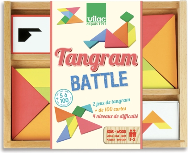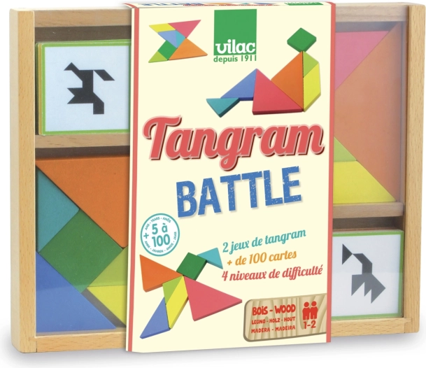 Tangram-duellen fra VILAC er et hurtigt og spændende brætspil, der udvikler logik, koncentration og kreativitet. Målet er hurtigst muligt at samle de farvede brikker til den silhuet, der vises på kortet. Takket være de forskellige sværhedsgrader kan hele familien være med.