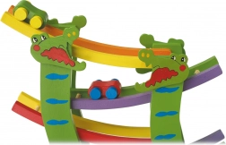 Denne træ-racerbane med krokodiller forvandler børneværelset til en lille racerbane. Børn placerer bilen ved start og ser den glide hurtigt ned gennem etagerne helt til mål. De klare farver og det muntre krokodillemotiv inviterer til leg igen og igen.