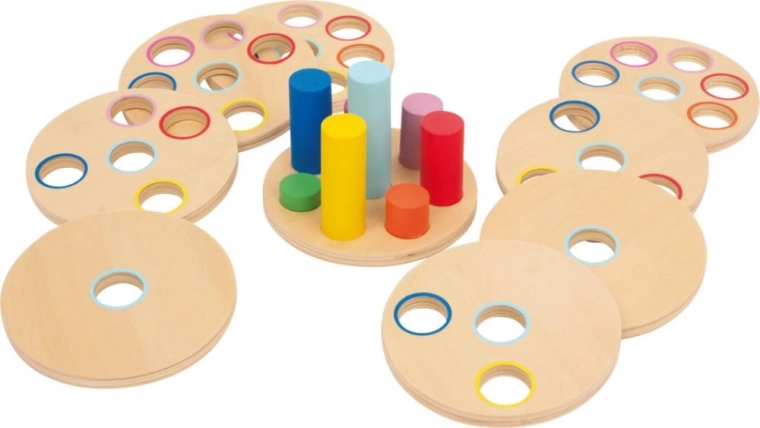 Stærke og holdbare skiver er lavet af fint slebet krydsfiner. Med forskellige længder af stænger og antal huller i skiverne bliver legetøjet naturligt en udfordring for små tænkere.