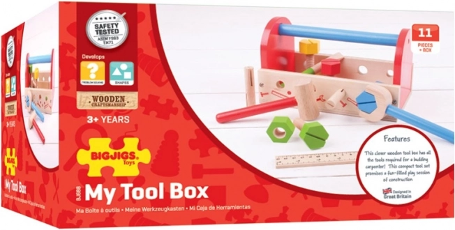 Sættet indeholder grundlæggende værktøjer – nøgle, hammer, skruetrækker og lineal – sammen med møtrikker og skruer, så børn kan øve sig i at spænde, hamre og måle. Legen udvikler finmotorik, øje–hånd-koordination og fremmer kreativ leg. Produktet opfylder aktuelle europæiske sikkerhedsstandarder og er fremstillet af materialer af høj kvalitet fra ansvarlige kilder.