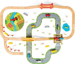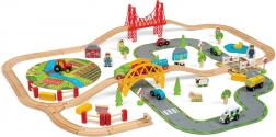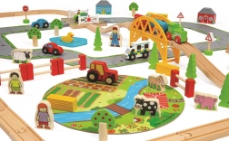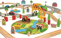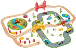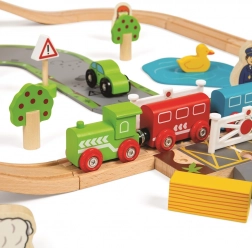 Denne trætogbane med landevej er den perfekte kombination af tog- og bilbaner, der efterligner den virkelige transportverden. Med broer og overkørsler kommer dine børn ind i en verden fuld af sjove eventyr. Alt er suppleret med lokale tilbehør som gård, bygninger og træer, der forskønner omgivelserne.
