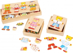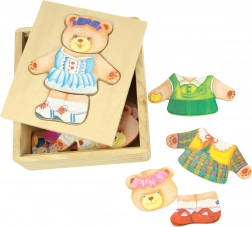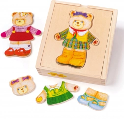 Påklædningspuslespillet med fru bjørn fra BIGJIGS TOYS underholder børn ved at lade dem sammensætte ansigter med forskellige udtryk og farverigt tøj. Pladen fungerer både som underlag og låg til æsken, så brikkerne nemt kan opbevares, og puslespillet er ideelt til at tage med på farten.