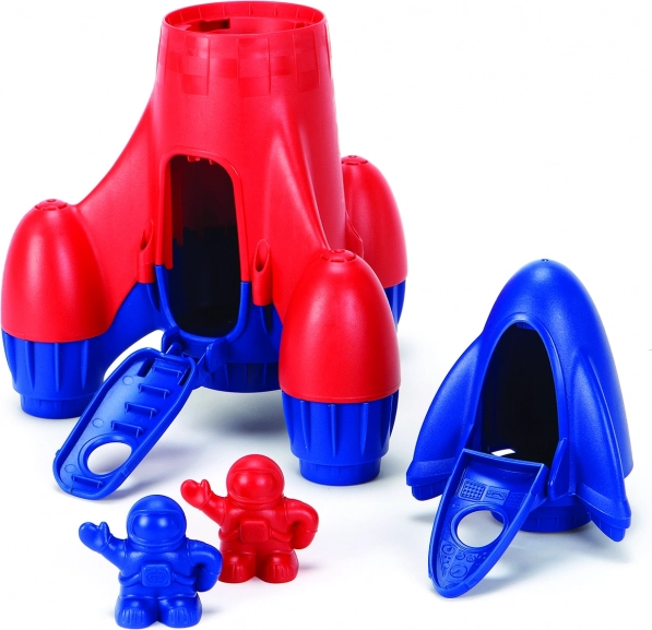 Tag på rummission med legetøjet GREEN TOYS – en blå raket lavet af genanvendt plast fra mælkeflasker. Sikker for børn, fri for PVC, BPA og ftalater, med aftagelig cockpit, åbne-/vipdøre og to astronauter til kreativ leg derhjemme, i sandkassen og ved vandet.