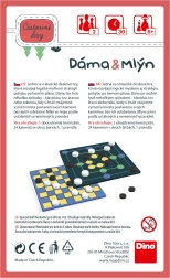 Rejseudgaven dam og mølle fra Dino er det ideelle valg til familieudflugter, ferier og ventetid på farten. Den dobbeltsidede plade vendes nemt – på den ene side er et 8 × 8 bræt til dam, på den anden klassisk opsætning til mølle. Ét sæt brikker rækker til begge spil, så du behøver ikke andet.