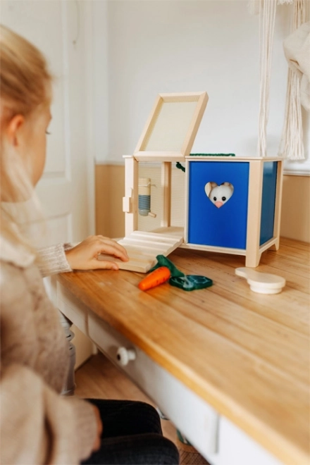 Funktionelle elementer støtter finmotorikken: taget løftes for nem adgang, dørene kan åbnes, og den lille rampe gør kaninens “udløb” lettere.