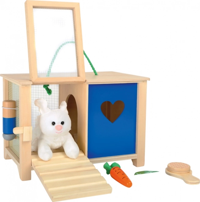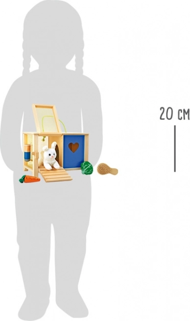 Sød pakke til små dyrepassere: plysbamse-kanin i en trækrybbe med klapdøre, rampe og tilbehør, der understøtter læring af ansvar og udvikling af fantasi. Takket være det bærbare håndtag kan børn tage kaninen med overalt; den sikre udførelse i træ er ideel fra 3 år.