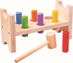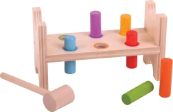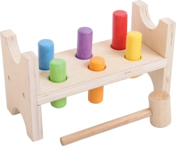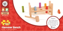 Denne klassiske træhammerbænk fra Bigjigs Baby begejstrer med sin enkle idé – tapperne bankes ned i hullerne med køllen, derefter vender man bænken, og legen kan begynde forfra. De klare farver stimulerer sanserne og fremmer koncentrationen.