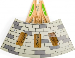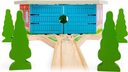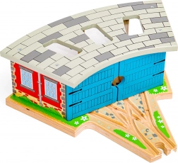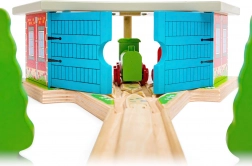 Det tredobbelte depot med porte er et ideelt tilbehør til enhver lille lokomotivfører. Med tre pladser og integreret skinneforbindelse organiserer du nemt trafikken på banen og parkerer togene efter en dag fuld af kørsel. Den solide trækonstruktion med farverige detaljer virker realistisk og tåler selv intensiv leg.