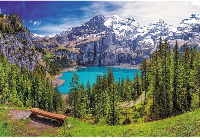 Puslespil med motiv af Oeschinensee i Alperne tilbyder ikke kun sjov, men hjælper også med afslapning og udvikling af koncentration. Under samlingen øver du tålmodighed, opmærksomhed og stimulerer logisk tænkning. Puslespillet er ideelt til fælles stunder med familie og venner.
