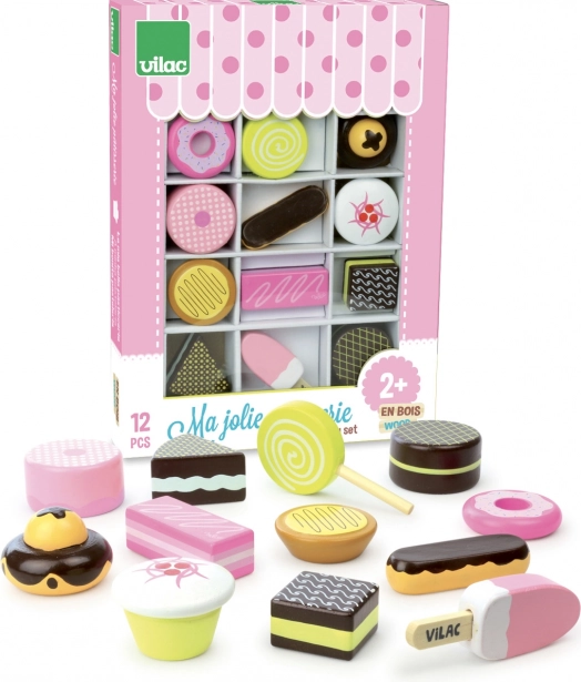 Giv små konditorer og kokke glæden ved leg med sættet af træsøde sager fra VILAC. De farverige kager og lækkerier ligner de ægte, passer perfekt i legekøkkenet og til købmandsleg og udvikler på fin vis både fantasi og finmotorik.