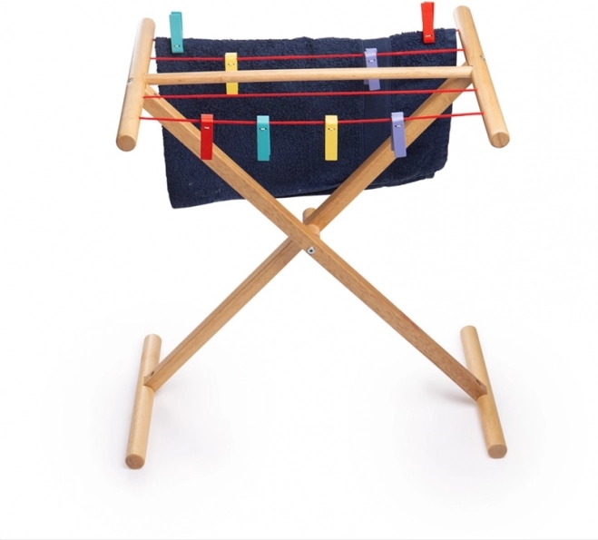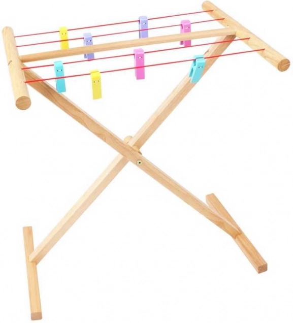 Dette træ tørrestativ til tøj er ideelt for små husmødre og fremmer kreativ og opfindsom leg. Takket være farverige klemmer er tørrestativet sjovt for ethvert barn.