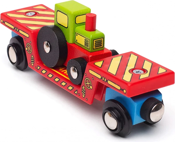 Dette farverige sæt bringer endnu mere fantasi ind i børnenes jernbaneunivers. Traktoren kan tages af vognen og bruges i leg på gården, eller lastes via lastefladen og sendes afsted på skinnerne. Takket være de magnetiske koblinger forbindes vognen hurtigt med lokomotiv og øvrige vogne, så udvidelse af den eksisterende togstamme klares på et øjeblik.