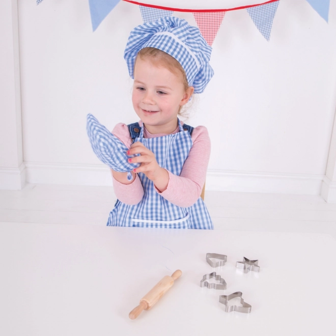 Unge kokke vil elske dette lyse og behageligt blå bomuldssæt til bagning og madlavning. Indeholder forklæde, grydelap, kokkehue, kagerulle og udstikkere, ideelt til sjov madlavning og rollespil.