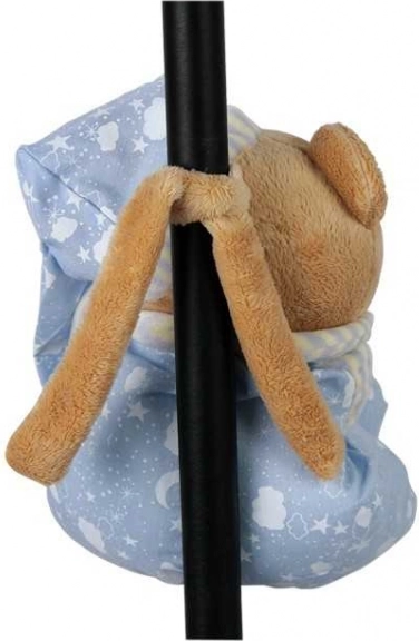 Bamsen har en blå pyjamas med stjerne- og månemønster, der skaber en beroligende atmosfære og er den ideelle ledsager i børneværelset.