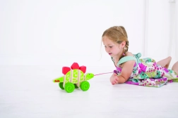 Denne kvalitets træktræks-dinosaur i træ er en fantastisk makker for børn fra 12 måneder. Takket være den robuste konstruktion og de glatte kanter er den sikker at lege med, mens de bevægelige dele og træksnoren understøtter den naturlige udvikling af koordination mellem hænder og fødder.