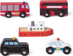 Udvid din by ved skinnerne med en farverig håndfuld af fem ikoniske køretøjer. Takket være robust træ, glatte kanter og let greb er legetøjet ideelt til små børnehænder. Hvert køretøj har frit roterende hjul (båden har malet skrog) og er klar til intensiv hverdagsleg.