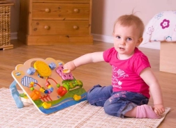 Perlelabyrint, drejelabyrint og skydbare elementer understøtter greb, hånd–øje-koordination og nysgerrig udforskning allerede fra 6 måneder.