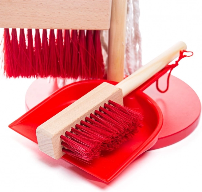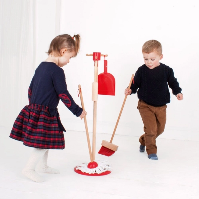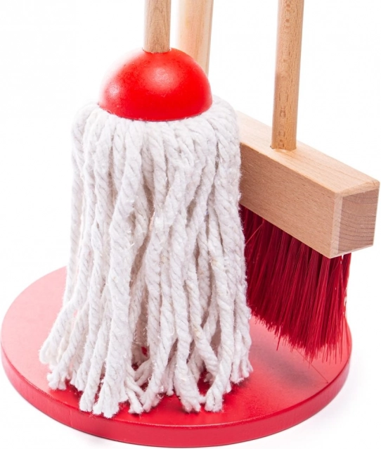 Det røde rengøringssæt til børn understøtter fantasifuld leg og leder naturligt børn til at lære huslige opgaver. Takket være den solide trækonstruktion og det gennemtænkte stativ har alle dele deres plads, så oprydning efter leg er lige så nem som selve legen.