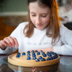 Den runde plade af glat træ og de blanke glaskugler giver en behagelig spilleoplevelse og lang holdbarhed.