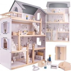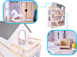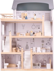 Huset har op til fire etager og tilbyder massere af plads til leg! Den træterrasse på øverste etage giver hele huset charme. Blandt de mange forskellige rum er der et badeværelse, et arbejdsværelse, en stue, en spisestue med køkkenniche og et soveværelse. Hvert rum er fuldt møbleret og klar til at byde en ny dukkefamilie velkommen. Takket være de store dimensioner kan ikke kun de mindste dukker passe indeni, så du behøver ikke at være bange for, at dit barns yndlingsven ikke kan deltage i sjov!