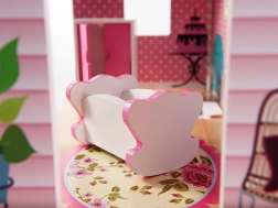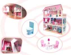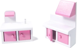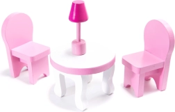 Omhyggeligt slebne dele sikrer sikker leg uden splinter. Åbningsbare låger i køkkenskabe, den gyngende vugge, bord med stole og garderobeskabet stimulerer fantasien og udvikler finmotorik samt sociale færdigheder ved fælles leg og indretning.