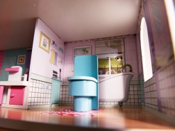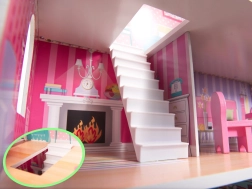 Huset tilbyder tre niveauer med fem rum, trapper og altaner. Farverige tryk på vægge og gulve skaber en hyggelig atmosfære til fantasifuld leg.