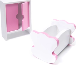 Inkluderer 9 stykker møbler: garderobeskab, vugge, lampe, 2 stole, bord, køkken med emhætte, skab med vask og toilet – klar til leg med det samme.