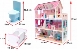 Dette rummelige trædukkehus vil glæde både børn og forældre. Tre etager med en minimumsetagehøjde på 18 cm rummer køkken, badeværelse, soveværelse, stue og trapper med små altaner. Medfølger stilfulde møbler af træ og plast samt en selvklæbende LED-stribe med koldt hvidt lys – ideel også som en blid natlampe.