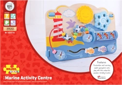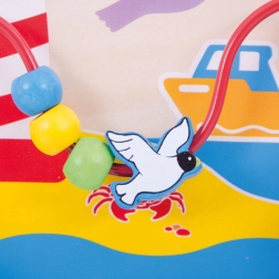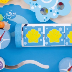 Drejelabyrint, roterende hav-søheste, skydbare fisk og perletråd med måger fastholder barnets opmærksomhed og udvikler finmotorik samt koordination.