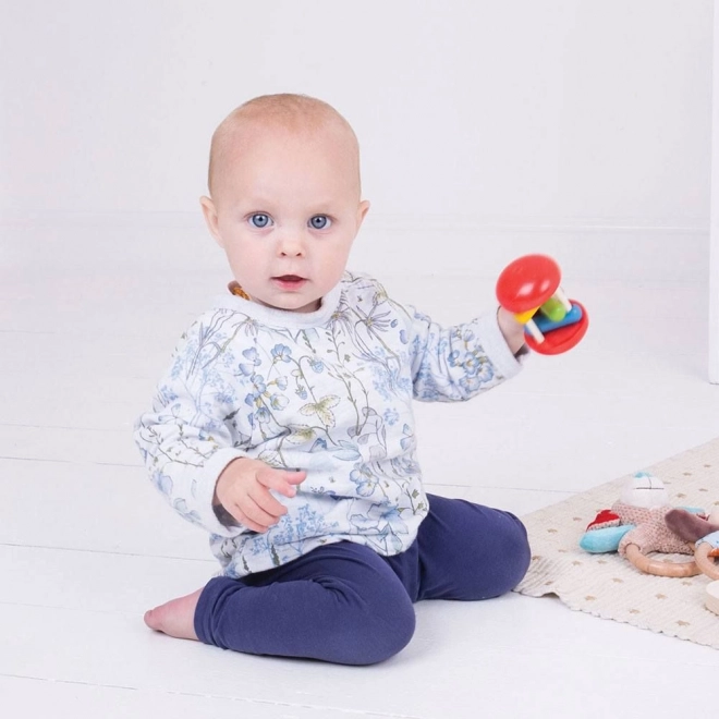 Regnbuecylinderen fra Bigjigs Baby er en tidløs træ-rangler, der imponerer med intense farver og en behagelig lyd. Tre farvede klodser gynger ved rulning eller rysten og rammer blidt støttepindene, hvilket motiverer barnet til videre udforskning, greb og bevægelse.