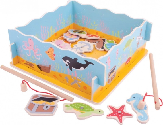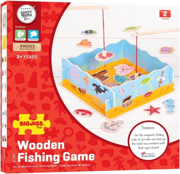 Børn fanger 11 fisk og andre dele, såsom en skattekiste, en støvle og et anker, ved hjælp af magnetiske stænger og øver præcision, når de placerer dem på de rigtige steder. Kvalitets trækonstruktion og sikre farver sikrer lang levetid og sikker leg.