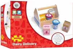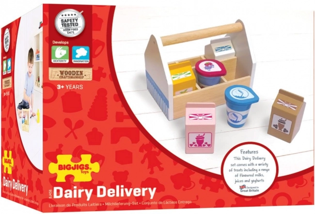 Denne robuste trækasse rummer fire drikkekartoner (mælk, appelsinjuice, jordbær- og chokoladeshake) plus et bæger yoghurt og fløde. Et ideelt supplement til børnekøkkenet og lege-butikken, som på en legende måde introducerer børn til grundlæggende sund ernæring og fødevarers oprindelse.