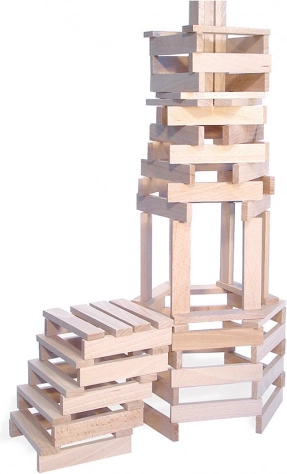 Dette tidløse træbyggesæt giver børn uendelige muligheder for at skabe – fra tårne og broer til originale arkitektoniske modeller. De ens mål på delene (10,5 × 2 × 0,7 cm) muliggør stabile konstruktioner uden brug af forbindelsesdele. Takket være det naturlige udtryk er legen både sjov og lærerig.